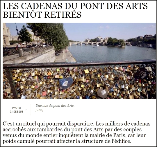 Toutefois, si vous souhaitez immortaliser votre amour par un cadenas sur le pont des Arts, il faudra faire vite, la tolérance accodée pourrait bien finir en interdiction …