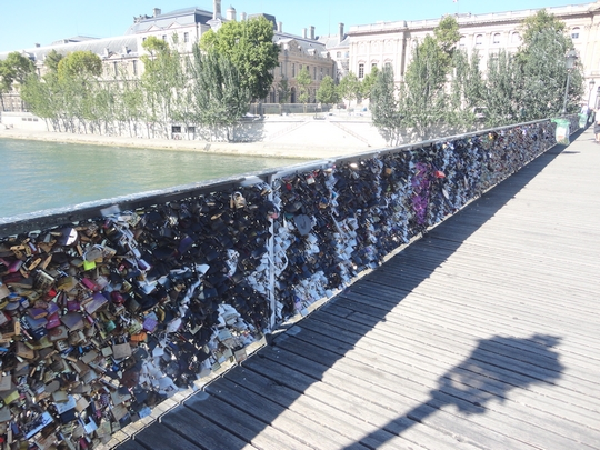 L’histoire des cadenas d’amour … les parapets grillagés du Pont des Arts sont le support de nombreux cadenas accrochés par des amoureux. Sur ces cadenas on trouve souvent des inscriptions réalisées au marqueur indélébile ou gravées, mentionnant les prénoms ou les initiales des deux amoureux, la date à laquelle le cadenas a été accroché, et pourquoi pas un petit message. Cette pratique est apparue sur le Pont des Arts vers 2008 (personnellement je dirai bien avant, mais peut-être pas ou moins connue et plutôt initiées par les parisiens ?). L’origine de cette pratique est assez floue : elle serait apparue à Moscou en Europe de l’Est ? En Allemagne ? En Hongrie dans les années 1980 et 1990, puis s’est propagée en Europe occidentale dans les années 2000 dans les grandes villes touristiques, voire au-delà comme à New-York. Cette pratique existe également en Chine où des cadenas sont accrochés au sommet d’une montagne sacrée par des jeunes mariés afin que leur union soit heureuse. Source wikipedia et moi-même)