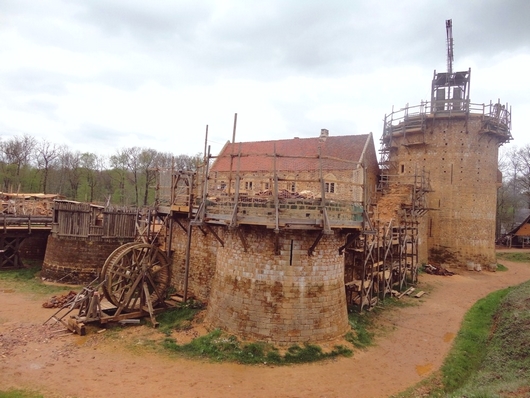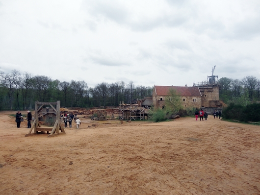 Au milieu d’un espace naturel mettant à disposition toutes les matières premières nécessaires à la construction : pierre, bois, terre, sable, argile…des carriers, tailleurs de pierre, maçons, bûcherons, charpentiers, forgeron, tuiliers, charretiers, vannier, cordier… bâtissent jour après jour un véritable château fort sous les yeux de milliers de visiteurs. Ce chantier, débuté en 1997, devrait durer environ 25 ans.